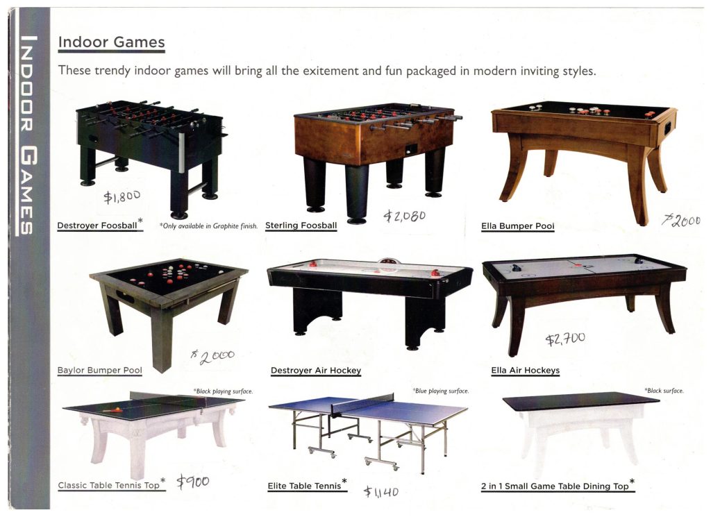 We can install Pool tables, bumper pool, shuffleboard, tennis, air hockey, foosball, darts, chess, backgammon, Mah Jongg + poker supplies, dining top/game tables with matching chairs, and even bars and stools.
